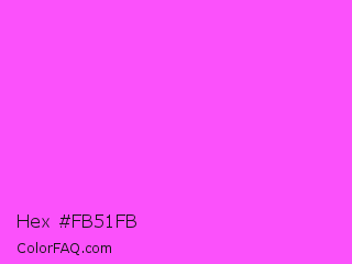 Hex #fb51fb Color is a light magenta color and the nearest color is Pink Flamingo Crayola #ff66ff. Hex code #fb51fb and RGB value is rgb(251,81,251). In RGB color space, this color is composed of 98% red, 32% green, 98% blue, In CMYK color space, this color is composed of 0% cyan, 68% magenta, 0% yellow , 2% black , In HSL color space, this color has a hue angle of 300° , 96% saturation and 65% lightness.