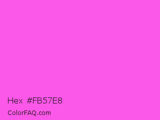 Hex #fb57e8 Color is a light magenta color and the nearest color is Purple Pizzazz #fe4eda. Hex code #fb57e8 and RGB value is rgb(251,87,232). In RGB color space, this color is composed of 98% red, 34% green, 91% blue, In CMYK color space, this color is composed of 0% cyan, 65% magenta, 8% yellow , 2% black , In HSL color space, this color has a hue angle of 307° , 95% saturation and 66% lightness.