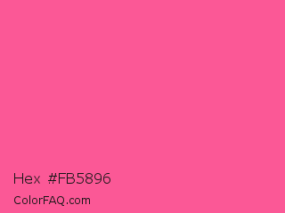 Hex #fb5896 Color is a light rose color and the nearest color is Violet Red #f75394. Hex code #fb5896 and RGB value is rgb(251,88,150). In RGB color space, this color is composed of 98% red, 35% green, 59% blue, In CMYK color space, this color is composed of 0% cyan, 65% magenta, 40% yellow , 2% black , In HSL color space, this color has a hue angle of 337° , 95% saturation and 66% lightness.