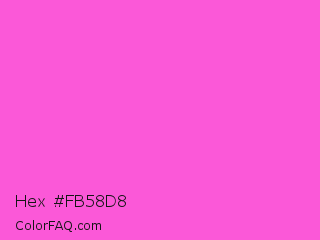 Hex #fb58d8 Color is a light magenta color and the nearest color is Purple Pizzazz #fe4eda. Hex code #fb58d8 and RGB value is rgb(251,88,216). In RGB color space, this color is composed of 98% red, 35% green, 85% blue, In CMYK color space, this color is composed of 0% cyan, 65% magenta, 14% yellow , 2% black , In HSL color space, this color has a hue angle of 313° , 95% saturation and 66% lightness.
