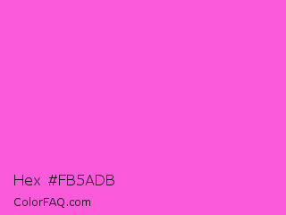 Hex #fb5adb Color is a light magenta color and the nearest color is Purple Pizzazz #fe4eda. Hex code #fb5adb and RGB value is rgb(251,90,219). In RGB color space, this color is composed of 98% red, 35% green, 86% blue, In CMYK color space, this color is composed of 0% cyan, 64% magenta, 13% yellow , 2% black , In HSL color space, this color has a hue angle of 312° , 95% saturation and 67% lightness.