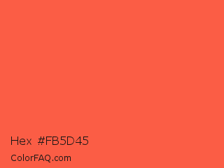 Hex #fb5d45 Color is a light red color and the nearest color is Tomato #ff6347. Hex code #fb5d45 and RGB value is rgb(251,93,69). In RGB color space, this color is composed of 98% red, 36% green, 27% blue, In CMYK color space, this color is composed of 0% cyan, 63% magenta, 73% yellow , 2% black , In HSL color space, this color has a hue angle of 8° , 96% saturation and 63% lightness.