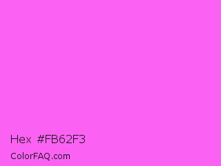 Hex #fb62f3 Color is a light magenta color and the nearest color is Pink Flamingo Crayola #ff66ff. Hex code #fb62f3 and RGB value is rgb(251,98,243). In RGB color space, this color is composed of 98% red, 38% green, 95% blue, In CMYK color space, this color is composed of 0% cyan, 61% magenta, 3% yellow , 2% black , In HSL color space, this color has a hue angle of 303° , 95% saturation and 68% lightness.