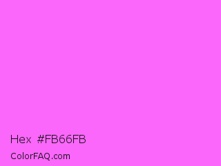 Hex #fb66fb Color is a light magenta color and the nearest color is Pink Flamingo Crayola #ff66ff. Hex code #fb66fb and RGB value is rgb(251,102,251). In RGB color space, this color is composed of 98% red, 40% green, 98% blue, In CMYK color space, this color is composed of 0% cyan, 59% magenta, 0% yellow , 2% black , In HSL color space, this color has a hue angle of 300° , 95% saturation and 69% lightness.