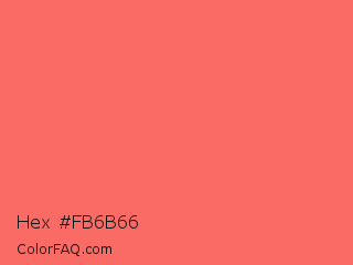 Hex #fb6b66 Color is a light red color and the nearest color is Pastel Red #ff6961. Hex code #fb6b66 and RGB value is rgb(251,107,102). In RGB color space, this color is composed of 98% red, 42% green, 40% blue, In CMYK color space, this color is composed of 0% cyan, 57% magenta, 59% yellow , 2% black , In HSL color space, this color has a hue angle of 2° , 95% saturation and 69% lightness.