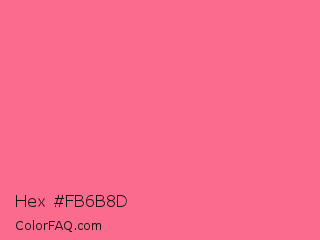 Hex #fb6b8d Color is a light red color and the nearest color is Light Crimson #f56991. Hex code #fb6b8d and RGB value is rgb(251,107,141). In RGB color space, this color is composed of 98% red, 42% green, 55% blue, In CMYK color space, this color is composed of 0% cyan, 57% magenta, 44% yellow , 2% black , In HSL color space, this color has a hue angle of 346° , 95% saturation and 70% lightness.
