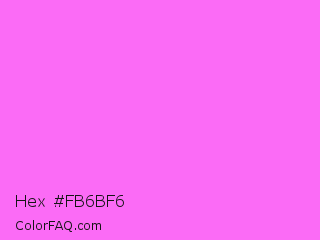 Hex #fb6bf6 Color is a light magenta color and the nearest color is Blush Pink #ff6fff. Hex code #fb6bf6 and RGB value is rgb(251,107,246). In RGB color space, this color is composed of 98% red, 42% green, 96% blue, In CMYK color space, this color is composed of 0% cyan, 57% magenta, 2% yellow , 2% black , In HSL color space, this color has a hue angle of 302° , 95% saturation and 70% lightness.
