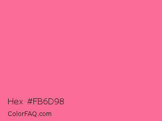 Hex #fb6d98 Color is a light rose color and the nearest color is French Pink #fd6c9e. Hex code #fb6d98 and RGB value is rgb(251,109,152). In RGB color space, this color is composed of 98% red, 43% green, 60% blue, In CMYK color space, this color is composed of 0% cyan, 57% magenta, 39% yellow , 2% black , In HSL color space, this color has a hue angle of 342° , 95% saturation and 71% lightness.