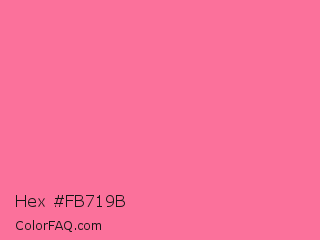 Hex #fb719b Color is a light rose color and the nearest color is French Pink #fd6c9e. Hex code #fb719b and RGB value is rgb(251,113,155). In RGB color space, this color is composed of 98% red, 44% green, 61% blue, In CMYK color space, this color is composed of 0% cyan, 55% magenta, 38% yellow , 2% black , In HSL color space, this color has a hue angle of 342° , 95% saturation and 71% lightness.