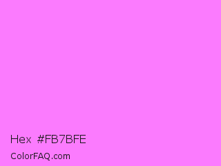 Hex #fb7bfe Color is a light magenta color and the nearest color is Fuchsia Pink #ff77ff. Hex code #fb7bfe and RGB value is rgb(251,123,254). In RGB color space, this color is composed of 98% red, 48% green, 100% blue, In CMYK color space, this color is composed of 1% cyan, 52% magenta, 0% yellow , 0% black , In HSL color space, this color has a hue angle of 299° , 98% saturation and 74% lightness.