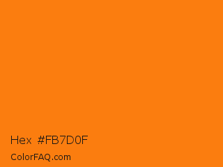 Hex #fb7d0f Color is a normal orange color and the nearest color is Ecstasy #fa7814. Hex code #fb7d0f and RGB value is rgb(251,125,15). In RGB color space, this color is composed of 98% red, 49% green, 6% blue, In CMYK color space, this color is composed of 0% cyan, 50% magenta, 94% yellow , 2% black , In HSL color space, this color has a hue angle of 28° , 97% saturation and 52% lightness.