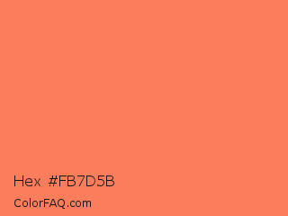 Hex #fb7d5b Color is a light red color and the nearest color is Coral #ff7f50. Hex code #fb7d5b and RGB value is rgb(251,125,91). In RGB color space, this color is composed of 98% red, 49% green, 36% blue, In CMYK color space, this color is composed of 0% cyan, 50% magenta, 64% yellow , 2% black , In HSL color space, this color has a hue angle of 13° , 95% saturation and 67% lightness.