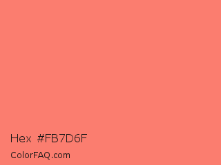 Hex #fb7d6f Color is a light red color and the nearest color is Coral Reef Hipster Salmon #fd7c6e. Hex code #fb7d6f and RGB value is rgb(251,125,111). In RGB color space, this color is composed of 98% red, 49% green, 44% blue, In CMYK color space, this color is composed of 0% cyan, 50% magenta, 56% yellow , 2% black , In HSL color space, this color has a hue angle of 6° , 95% saturation and 71% lightness.