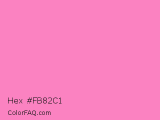 Hex #fb82c1 Color is a light rose color and the nearest color is Persian Pink #f77fbe. Hex code #fb82c1 and RGB value is rgb(251,130,193). In RGB color space, this color is composed of 98% red, 51% green, 76% blue, In CMYK color space, this color is composed of 0% cyan, 48% magenta, 23% yellow , 2% black , In HSL color space, this color has a hue angle of 329° , 94% saturation and 75% lightness.