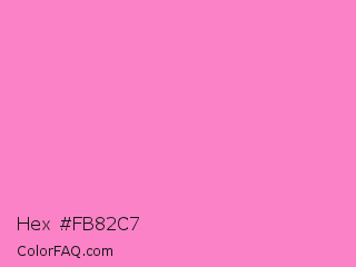 Hex #fb82c7 Color is a light magenta color and the nearest color is Princess Perfume #ff85cf. Hex code #fb82c7 and RGB value is rgb(251,130,199). In RGB color space, this color is composed of 98% red, 51% green, 78% blue, In CMYK color space, this color is composed of 0% cyan, 48% magenta, 21% yellow , 2% black , In HSL color space, this color has a hue angle of 326° , 94% saturation and 75% lightness.