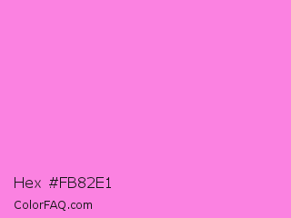 Hex #fb82e1 Color is a light magenta color and the nearest color is Pale Magenta #f984e5. Hex code #fb82e1 and RGB value is rgb(251,130,225). In RGB color space, this color is composed of 98% red, 51% green, 88% blue, In CMYK color space, this color is composed of 0% cyan, 48% magenta, 10% yellow , 2% black , In HSL color space, this color has a hue angle of 313° , 94% saturation and 75% lightness.