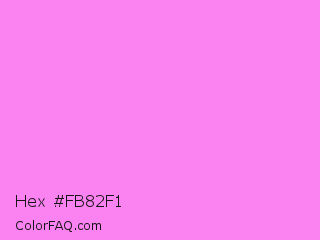 Hex #fb82f1 Color is a light magenta color and the nearest color is Light Fuchsia Pink #f984ef. Hex code #fb82f1 and RGB value is rgb(251,130,241). In RGB color space, this color is composed of 98% red, 51% green, 95% blue, In CMYK color space, this color is composed of 0% cyan, 48% magenta, 4% yellow , 2% black , In HSL color space, this color has a hue angle of 305° , 94% saturation and 75% lightness.