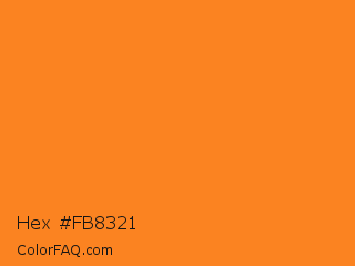 Hex #fb8321 Color is a normal orange color and the nearest color is Princeton Orange #f58025. Hex code #fb8321 and RGB value is rgb(251,131,33). In RGB color space, this color is composed of 98% red, 51% green, 13% blue, In CMYK color space, this color is composed of 0% cyan, 48% magenta, 87% yellow , 2% black , In HSL color space, this color has a hue angle of 27° , 96% saturation and 56% lightness.