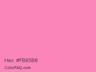 Hex #fb85b8 Color is a light rose color and the nearest color is Persian Pink #f77fbe. Hex code #fb85b8 and RGB value is rgb(251,133,184). In RGB color space, this color is composed of 98% red, 52% green, 72% blue, In CMYK color space, this color is composed of 0% cyan, 47% magenta, 27% yellow , 2% black , In HSL color space, this color has a hue angle of 334° , 94% saturation and 75% lightness.