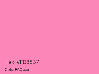 Hex #fb86b7 Color is a light rose color and the nearest color is Persian Pink #f77fbe. Hex code #fb86b7 and RGB value is rgb(251,134,183). In RGB color space, this color is composed of 98% red, 53% green, 72% blue, In CMYK color space, this color is composed of 0% cyan, 47% magenta, 27% yellow , 2% black , In HSL color space, this color has a hue angle of 335° , 94% saturation and 75% lightness.