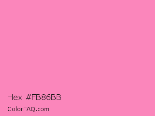 Hex #fb86bb Color is a light rose color and the nearest color is Persian Pink #f77fbe. Hex code #fb86bb and RGB value is rgb(251,134,187). In RGB color space, this color is composed of 98% red, 53% green, 73% blue, In CMYK color space, this color is composed of 0% cyan, 47% magenta, 25% yellow , 2% black , In HSL color space, this color has a hue angle of 333° , 94% saturation and 75% lightness.