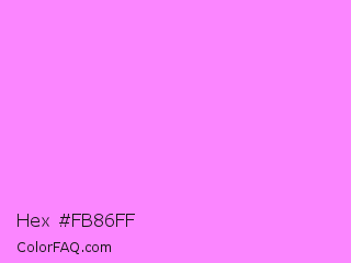 Hex #fb86ff Color is a light magenta color and the nearest color is Fuchsia Pink #ff77ff. Hex code #fb86ff and RGB value is rgb(251,134,255). In RGB color space, this color is composed of 98% red, 53% green, 100% blue, In CMYK color space, this color is composed of 2% cyan, 47% magenta, 0% yellow , 0% black , In HSL color space, this color has a hue angle of 298° , 100% saturation and 76% lightness.