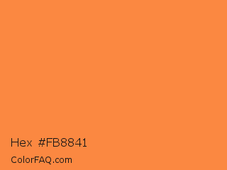Hex #fb8841 Color is a light orange color and the nearest color is Mango Tango #ff8243. Hex code #fb8841 and RGB value is rgb(251,136,65). In RGB color space, this color is composed of 98% red, 53% green, 25% blue, In CMYK color space, this color is composed of 0% cyan, 46% magenta, 74% yellow , 2% black , In HSL color space, this color has a hue angle of 23° , 96% saturation and 62% lightness.