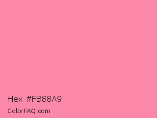 Hex #fb88a9 Color is a light rose color and the nearest color is Tickle Me Pink #fc89ac. Hex code #fb88a9 and RGB value is rgb(251,136,169). In RGB color space, this color is composed of 98% red, 53% green, 66% blue, In CMYK color space, this color is composed of 0% cyan, 46% magenta, 33% yellow , 2% black , In HSL color space, this color has a hue angle of 343° , 93% saturation and 76% lightness.