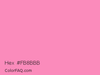 Hex #fb8bbb Color is a light rose color and the nearest color is Persian Pink #f77fbe. Hex code #fb8bbb and RGB value is rgb(251,139,187). In RGB color space, this color is composed of 98% red, 55% green, 73% blue, In CMYK color space, this color is composed of 0% cyan, 45% magenta, 25% yellow , 2% black , In HSL color space, this color has a hue angle of 334° , 93% saturation and 76% lightness.