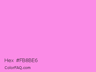 Hex #fb8be6 Color is a light magenta color and the nearest color is Pale Magenta #f984e5. Hex code #fb8be6 and RGB value is rgb(251,139,230). In RGB color space, this color is composed of 98% red, 55% green, 90% blue, In CMYK color space, this color is composed of 0% cyan, 45% magenta, 8% yellow , 2% black , In HSL color space, this color has a hue angle of 311° , 93% saturation and 76% lightness.