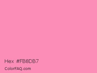 Hex #fb8db7 Color is a light rose color and the nearest color is Schauss Pink #ff91af. Hex code #fb8db7 and RGB value is rgb(251,141,183). In RGB color space, this color is composed of 98% red, 55% green, 72% blue, In CMYK color space, this color is composed of 0% cyan, 44% magenta, 27% yellow , 2% black , In HSL color space, this color has a hue angle of 337° , 93% saturation and 77% lightness.