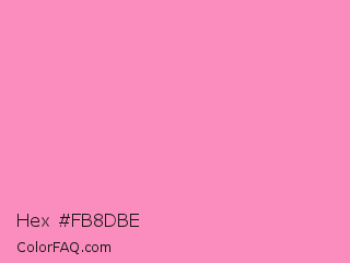 Hex #fb8dbe Color is a light rose color and the nearest color is Persian Pink #f77fbe. Hex code #fb8dbe and RGB value is rgb(251,141,190). In RGB color space, this color is composed of 98% red, 55% green, 75% blue, In CMYK color space, this color is composed of 0% cyan, 44% magenta, 24% yellow , 2% black , In HSL color space, this color has a hue angle of 333° , 93% saturation and 77% lightness.