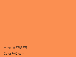 Hex #fb8f51 Color is a light orange color and the nearest color is Coral #ff7f50. Hex code #fb8f51 and RGB value is rgb(251,143,81). In RGB color space, this color is composed of 98% red, 56% green, 32% blue, In CMYK color space, this color is composed of 0% cyan, 43% magenta, 68% yellow , 2% black , In HSL color space, this color has a hue angle of 22° , 96% saturation and 65% lightness.