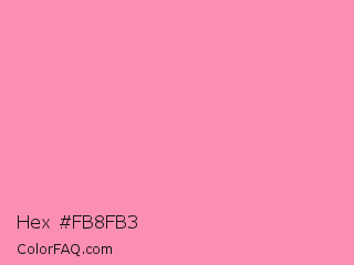 Hex #fb8fb3 Color is a light rose color and the nearest color is Schauss Pink #ff91af. Hex code #fb8fb3 and RGB value is rgb(251,143,179). In RGB color space, this color is composed of 98% red, 56% green, 70% blue, In CMYK color space, this color is composed of 0% cyan, 43% magenta, 29% yellow , 2% black , In HSL color space, this color has a hue angle of 340° , 93% saturation and 77% lightness.