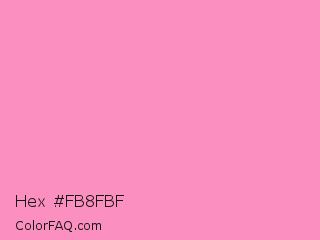 Hex #fb8fbf Color is a light rose color and the nearest color is Pastel Magenta #f49ac2. Hex code #fb8fbf and RGB value is rgb(251,143,191). In RGB color space, this color is composed of 98% red, 56% green, 75% blue, In CMYK color space, this color is composed of 0% cyan, 43% magenta, 24% yellow , 2% black , In HSL color space, this color has a hue angle of 333° , 93% saturation and 77% lightness.
