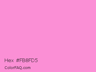 Hex #fb8fd5 Color is a light magenta color and the nearest color is Princess Perfume #ff85cf. Hex code #fb8fd5 and RGB value is rgb(251,143,213). In RGB color space, this color is composed of 98% red, 56% green, 84% blue, In CMYK color space, this color is composed of 0% cyan, 43% magenta, 15% yellow , 2% black , In HSL color space, this color has a hue angle of 321° , 93% saturation and 77% lightness.