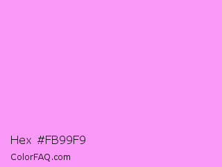 Hex #fb99f9 Color is a light magenta color and the nearest color is Rich Brilliant Lavender #f1a7fe. Hex code #fb99f9 and RGB value is rgb(251,153,249). In RGB color space, this color is composed of 98% red, 60% green, 98% blue, In CMYK color space, this color is composed of 0% cyan, 39% magenta, 1% yellow , 2% black , In HSL color space, this color has a hue angle of 301° , 92% saturation and 79% lightness.