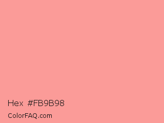 Hex #fb9b98 Color is a light red color and the nearest color is Light Salmon Pink #ff9999. Hex code #fb9b98 and RGB value is rgb(251,155,152). In RGB color space, this color is composed of 98% red, 61% green, 60% blue, In CMYK color space, this color is composed of 0% cyan, 38% magenta, 39% yellow , 2% black , In HSL color space, this color has a hue angle of 2° , 93% saturation and 79% lightness.