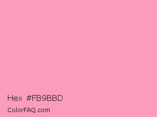 Hex #fb9bbd Color is a light rose color and the nearest color is Pastel Magenta #f49ac2. Hex code #fb9bbd and RGB value is rgb(251,155,189). In RGB color space, this color is composed of 98% red, 61% green, 74% blue, In CMYK color space, this color is composed of 0% cyan, 38% magenta, 25% yellow , 2% black , In HSL color space, this color has a hue angle of 339° , 92% saturation and 80% lightness.