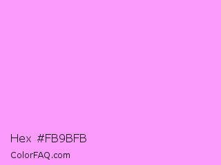 Hex #fb9bfb Color is a light magenta color and the nearest color is Rich Brilliant Lavender #f1a7fe. Hex code #fb9bfb and RGB value is rgb(251,155,251). In RGB color space, this color is composed of 98% red, 61% green, 98% blue, In CMYK color space, this color is composed of 0% cyan, 38% magenta, 0% yellow , 2% black , In HSL color space, this color has a hue angle of 300° , 92% saturation and 80% lightness.