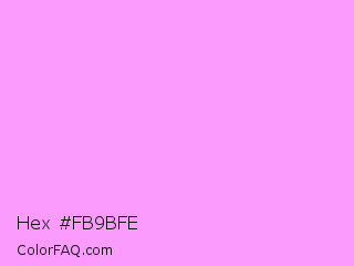 Hex #fb9bfe Color is a light magenta color and the nearest color is Rich Brilliant Lavender #f1a7fe. Hex code #fb9bfe and RGB value is rgb(251,155,254). In RGB color space, this color is composed of 98% red, 61% green, 100% blue, In CMYK color space, this color is composed of 1% cyan, 39% magenta, 0% yellow , 0% black , In HSL color space, this color has a hue angle of 298° , 98% saturation and 80% lightness.