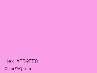 Hex #fb9ee8 Color is a light magenta color and the nearest color is Lavender Rose #fba0e3. Hex code #fb9ee8 and RGB value is rgb(251,158,232). In RGB color space, this color is composed of 98% red, 62% green, 91% blue, In CMYK color space, this color is composed of 0% cyan, 37% magenta, 8% yellow , 2% black , In HSL color space, this color has a hue angle of 312° , 92% saturation and 80% lightness.
