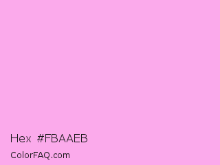 Hex #fbaaeb Color is a very light magenta color and the nearest color is Lavender Rose #fba0e3. Hex code #fbaaeb and RGB value is rgb(251,170,235). In RGB color space, this color is composed of 98% red, 67% green, 92% blue, In CMYK color space, this color is composed of 0% cyan, 32% magenta, 6% yellow , 2% black , In HSL color space, this color has a hue angle of 312° , 91% saturation and 83% lightness.