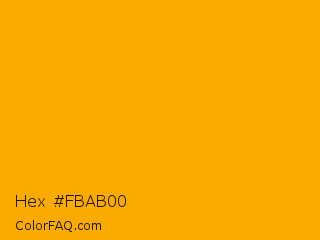 Hex #fbab00 Color is a normal orange color and the nearest color is Yellow Sea #fea904. Hex code #fbab00 and RGB value is rgb(251,171,0). In RGB color space, this color is composed of 98% red, 67% green, 0% blue, In CMYK color space, this color is composed of 0% cyan, 32% magenta, 100% yellow , 2% black , In HSL color space, this color has a hue angle of 41° , 100% saturation and 49% lightness.