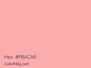 Hex #fbacae Color is a very light red color and the nearest color is Cornflower Lilac #ffb0ac. Hex code #fbacae and RGB value is rgb(251,172,174). In RGB color space, this color is composed of 98% red, 67% green, 68% blue, In CMYK color space, this color is composed of 0% cyan, 31% magenta, 31% yellow , 2% black , In HSL color space, this color has a hue angle of 358° , 91% saturation and 83% lightness.
