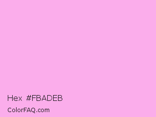 Hex #fbadeb Color is a very light magenta color and the nearest color is Light Hot Pink #ffb3de. Hex code #fbadeb and RGB value is rgb(251,173,235). In RGB color space, this color is composed of 98% red, 68% green, 92% blue, In CMYK color space, this color is composed of 0% cyan, 31% magenta, 6% yellow , 2% black , In HSL color space, this color has a hue angle of 312° , 91% saturation and 83% lightness.