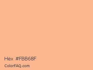 Hex #fbb68f Color is a light orange color and the nearest color is Macaroni And Cheese #ffbd88. Hex code #fbb68f and RGB value is rgb(251,182,143). In RGB color space, this color is composed of 98% red, 71% green, 56% blue, In CMYK color space, this color is composed of 0% cyan, 27% magenta, 43% yellow , 2% black , In HSL color space, this color has a hue angle of 22° , 93% saturation and 77% lightness.