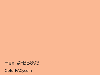 Hex #fbb893 Color is a light orange color and the nearest color is Macaroni And Cheese #ffbd88. Hex code #fbb893 and RGB value is rgb(251,184,147). In RGB color space, this color is composed of 98% red, 72% green, 58% blue, In CMYK color space, this color is composed of 0% cyan, 27% magenta, 41% yellow , 2% black , In HSL color space, this color has a hue angle of 21° , 93% saturation and 78% lightness.