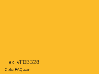 Hex #fbbb28 Color is a normal orange color and the nearest color is Lightning Yellow #fcc01e. Hex code #fbbb28 and RGB value is rgb(251,187,40). In RGB color space, this color is composed of 98% red, 73% green, 16% blue, In CMYK color space, this color is composed of 0% cyan, 25% magenta, 84% yellow , 2% black , In HSL color space, this color has a hue angle of 42° , 96% saturation and 57% lightness.