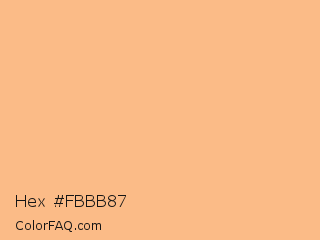 Hex #fbbb87 Color is a light orange color and the nearest color is Macaroni And Cheese #ffbd88. Hex code #fbbb87 and RGB value is rgb(251,187,135). In RGB color space, this color is composed of 98% red, 73% green, 53% blue, In CMYK color space, this color is composed of 0% cyan, 25% magenta, 46% yellow , 2% black , In HSL color space, this color has a hue angle of 27° , 94% saturation and 76% lightness.